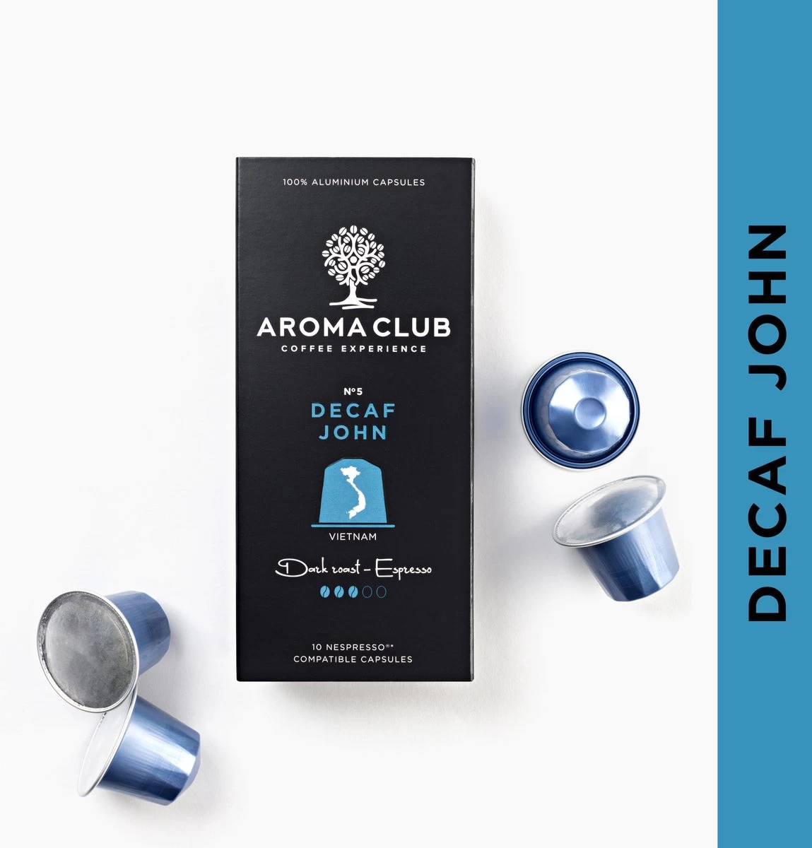 Aroma Club – Nespresso Compatible Capsules (120 St.) – No. 5 Decaf John – Intensiteit 3/5 – Decaf – 100% Aluminium Koffiecups