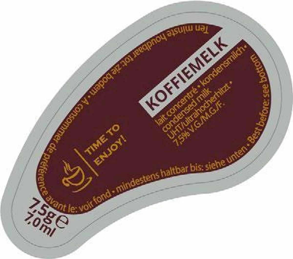 Time to Enjoy koffiemelkcups zijn verpakt per doos met 200 cups van 7,5 gram koffiemelk. 1 koffiemelkcupje is precies goed voor 1 kopje koffie. 7,5% vet.